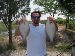 Fishermen from Cape MayCounty fishing in the areas of the old grounds and other offshore structure are returning with some impressive flounder. Offshore flounder fishing offers the best shot at large flounder and a bag limit catch. The Delaware Bay is also producing keeper flounder. Back Bay flounder fishing takes much more effort to find keeper size flounder this time of the year but if you are patient, you will find a few keepers. Last trip out in theBack BayI put three keepers to 22” in the cooler. The water temperature was 64 degrees in the Back Bay. The air temperature was 95 on the water and 105 degrees in town. During a heat wave in this area the wind blows from the S.W.. South west wind causes upwelling, lowering the water temperature. If the water temperature drops more than 5 degrees in a 24 hour period the fish will not feed much, if at all. It takes a few days for them to adjust to the change in water temperature. Upwelling may slow the bite but it is good for the fish.