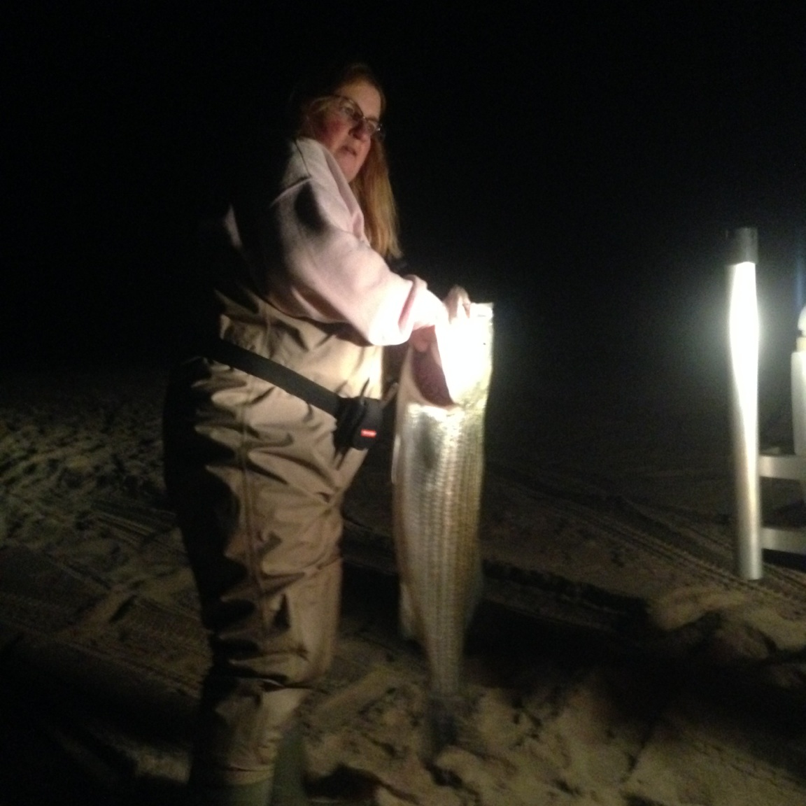 Jeff Polhamus with a quality striped bass he caught from the surf.